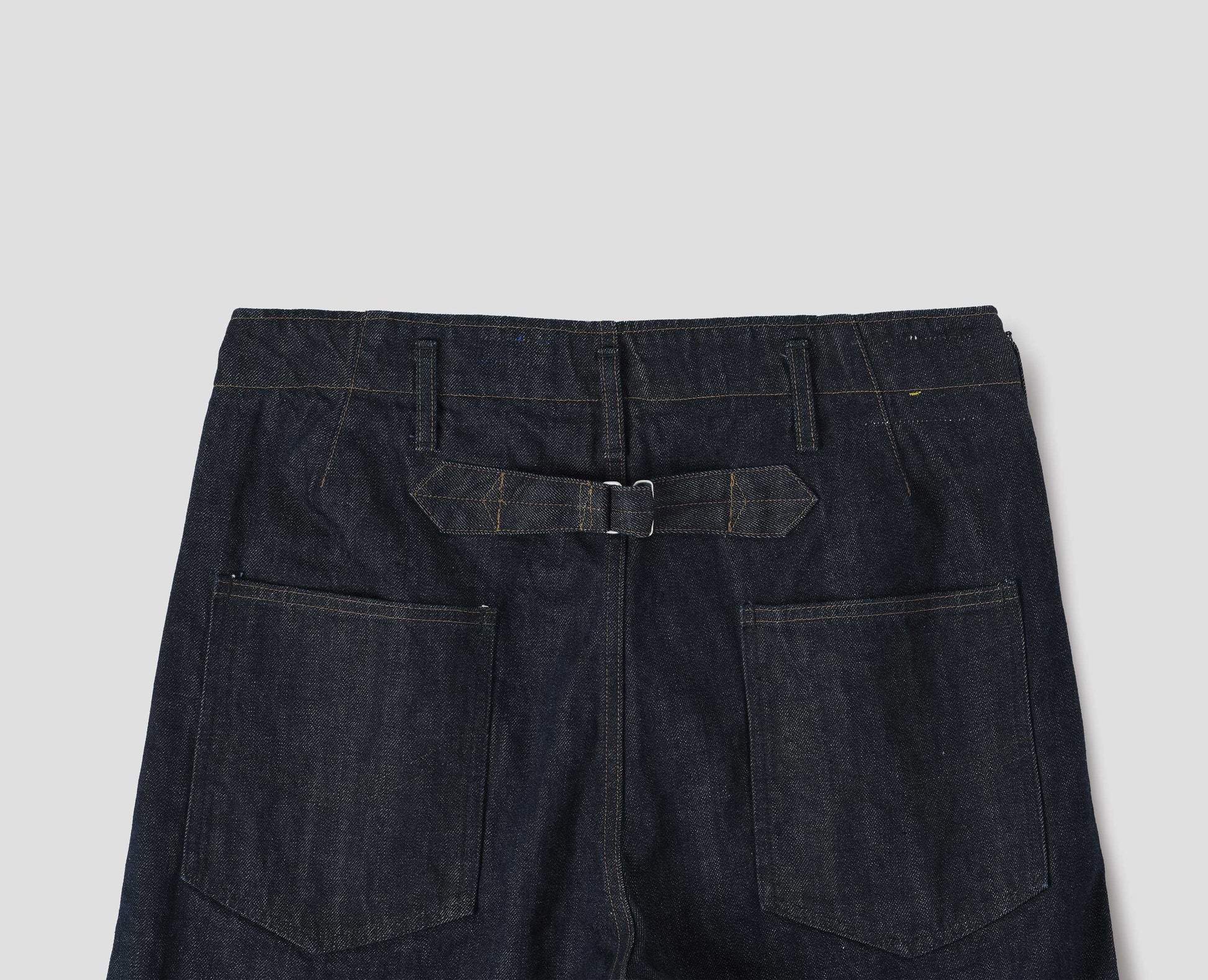 Cotton denim twill worker jeans. Straight cut. White selvedge with button fly. Grown on waistband with belt loops. Stitch-through slant pockets. Cinch on back. Back pockets with half cotton lining and stitch detail.