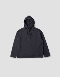 The MHL. Button Hoodie has an oversized cut and dropped shoulder and is fabricated in midweight cotton jersey with a dry hand feel. The style is constructed with a drawcord hood with herringbone tape detailing, straight cuffs, and flatlock stitch seam detailing.