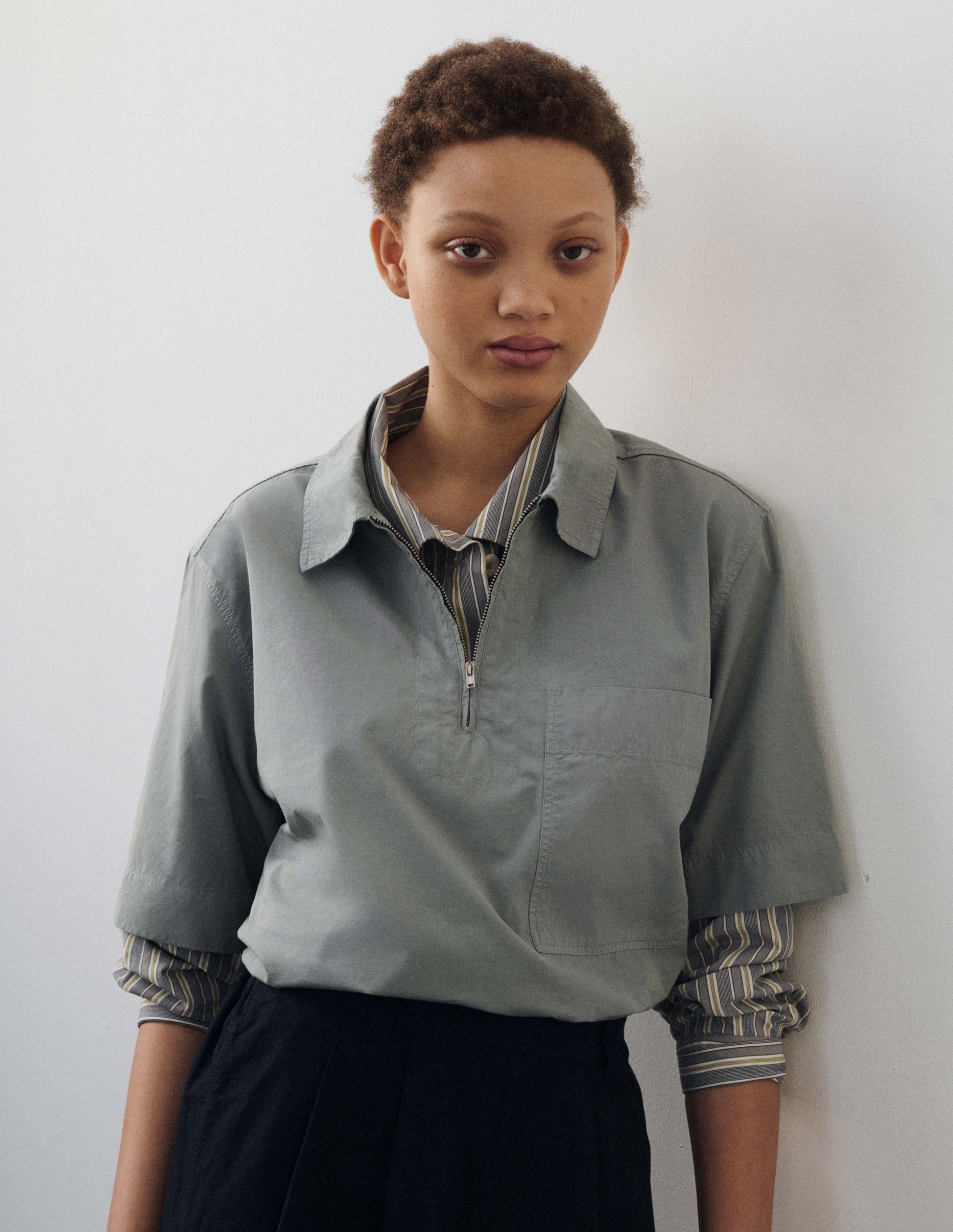 The MHL. Half Zip Shirt has a relaxed cut. It is fabricated in dense cotton poplin with a papery hand feel, in colours developed exclusively for MHL. The shirt is constructed with a wide stitch-through placket with half zip, patch chest pocket, side split hem with herringbone tape facing, and a wide box pleat on the back yoke.