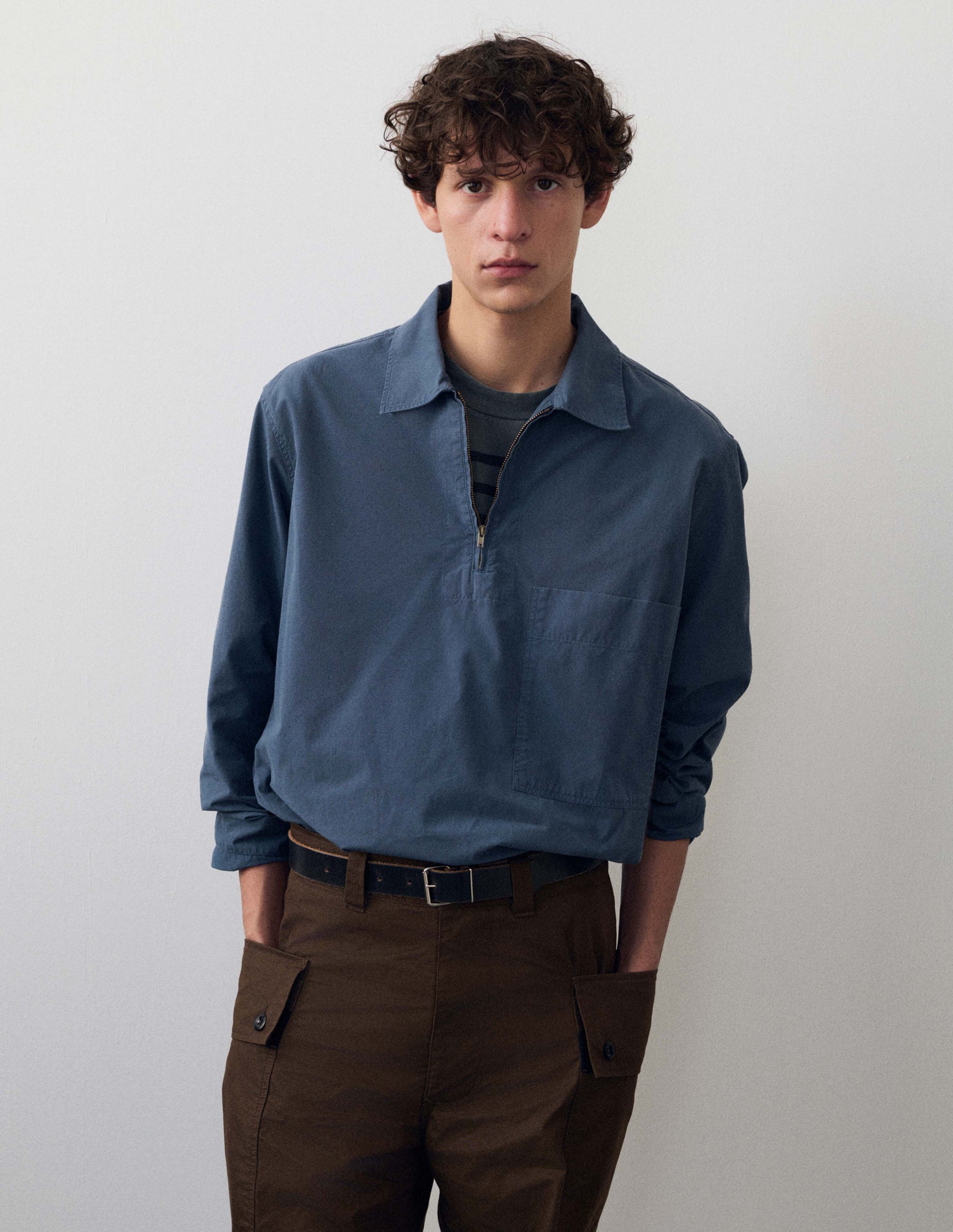 The MHL. Long Sleeve Half Zip Pull On Shirt has a relaxed cut. It is fabricated in cotton poplin with a soft, crisp hand feel, in colours exclusive to MHL. It is constructed with a wide stitch-through placket with half zip, large patch chest pocket, straight cuff, and side split hem with herringbone tape facing. The back yoke features a wide box pleat.