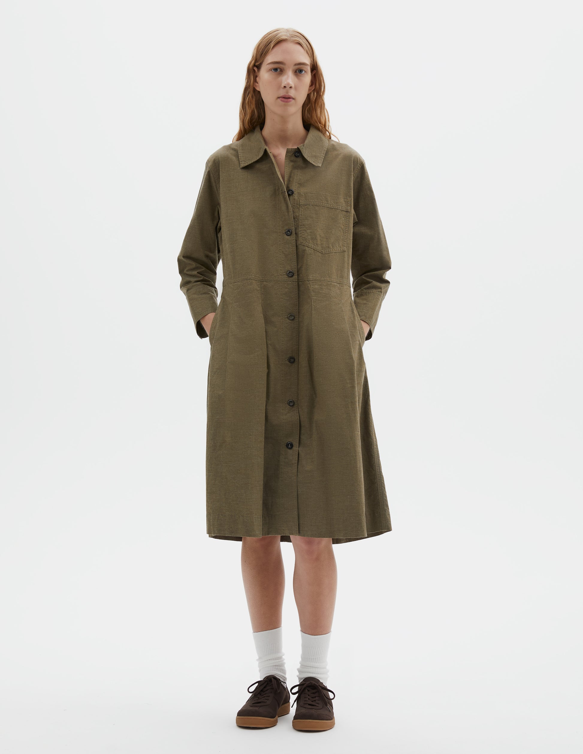 The MHL. Pleated Shirt Dress has a regular cut. It is fabricated in end on end cotton poplin with a brushed finish and soft hand feel, in colours developed exclusively for MHL. The dress is constructed with a button-through placket, a patch chest pocket, stitch-down pleats and double button fastening cuffs.
